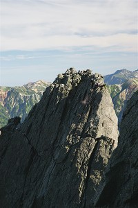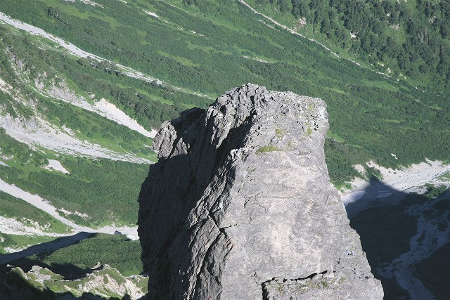 ルートは一部を除いて殆ど上りと下り、分けてあり一方通行でした。上りで北側を巻いて行くと小槍がすぐそこに見えています。ちょうどクライマーが懸垂下降していました。