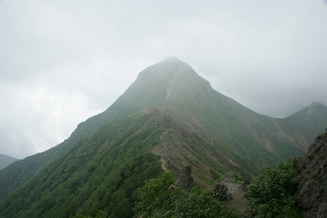 鉄梯子をいくつか登ってようやく稜線上、中岳、阿弥陀岳との分岐に出ました。ここから中岳と重なって立派に聳える阿弥陀岳です。写真の登山者の方々はこれから下山されるところです。