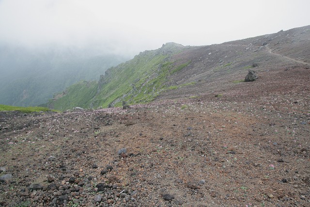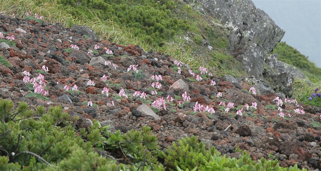 砂礫の斜面に無数に咲くコマクサです。生憎空は雲に覆われ、遠くから雷も聞こえてきます。雨が近づいてきましたので、コマクサを写真に収めて先を急ぎました。コルに立つ小屋でレインウェアを着、雷雨の中の硫黄岳登頂、下山となってしまいました。