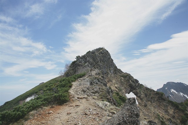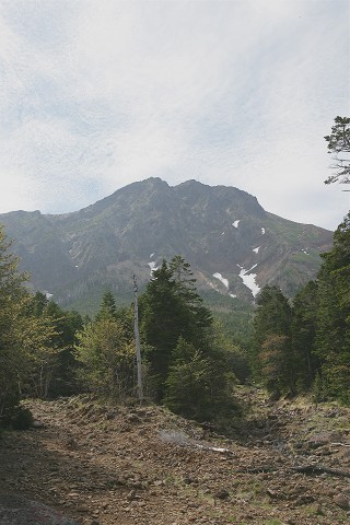 阿弥陀岳、中岳、赤岳へ稜線が続きます。この付近まで上がってくると山肌のダケカンバはまだ小さな新芽をつけたばかり、もう少ししたら鮮やかな新緑色に輝くことでしょう。