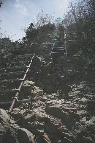 緩やかな樹林帯を抜け、尾根を登って行くと以前はなかった岩場に立派な鉄階段がつけてありました。