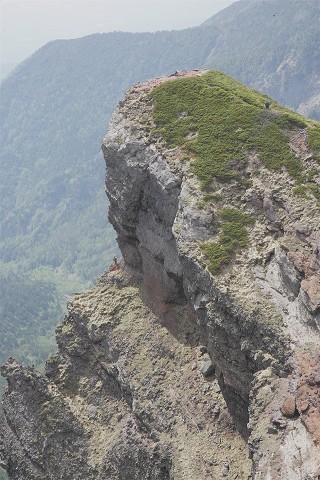 横岳山頂のすぐ下に巨大な岩、大同心があります。そのオーバーハングした壁を登っているクライマーの姿がありました。