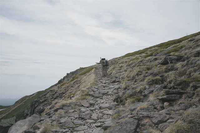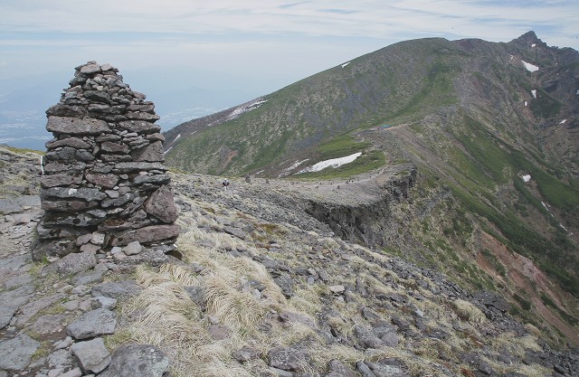 横岳を硫黄岳山荘へ下って少し休憩を取りました。そこから最後の登り、ケルンに沿って硫黄岳へ登って行きます。ここまで来るとさすがに足が重たくなりました。