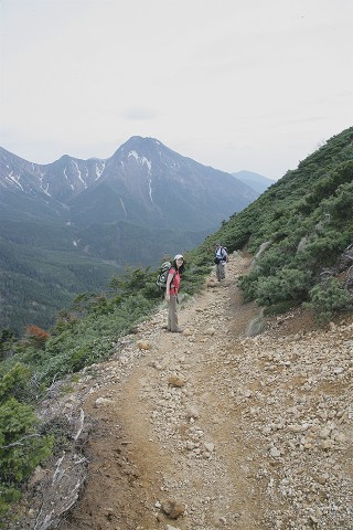 これから行く硫黄岳のなだらかな山容と大同心がまだ遠くに見えています。