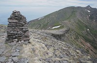 アップダウンを繰り返して山頂までやってきました。途中の斜面一帯にツクモグサ、岩場の陰にチョウノスケソウ、ハイマツ帯に添うようにキバナシャクナゲなどが綺麗に咲いていました。